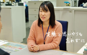 - Q. 現在の仕事の内容を教えてください。中途採用の担当です。さまざまな部署から「こ んな人材が欲しい」との要望を受け、転職エー ジェントに連絡して人材を探してもらいます。 両者と何度もやりとりを重ね、最後に希望に ぴったりと合った人材の採用が決まると、関 係者がみな喜んでくれてうれしいですね。Q. 高校生へメッセージをお願いします。現在の仕事は初めて自分から選び取った仕事です。やりたいことがすぐに決まらなくても大丈夫! 希望通りでなくても、どんな仕事でも、まずは働いてみること。そうすればいつか本当にやりたいことに出あえます。