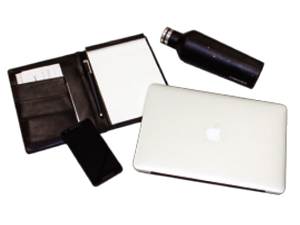 牧さん愛用の仕事グッズは、PC、スマホ、ノート、タンブラー。