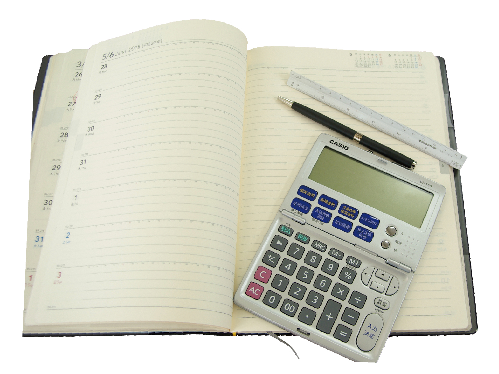 川野さんの仕事グッズ。縮尺図面の読み取りに使う三角スケール、契約時に使用するパーカー社のボールペン、金融電卓、スケジュール帳。