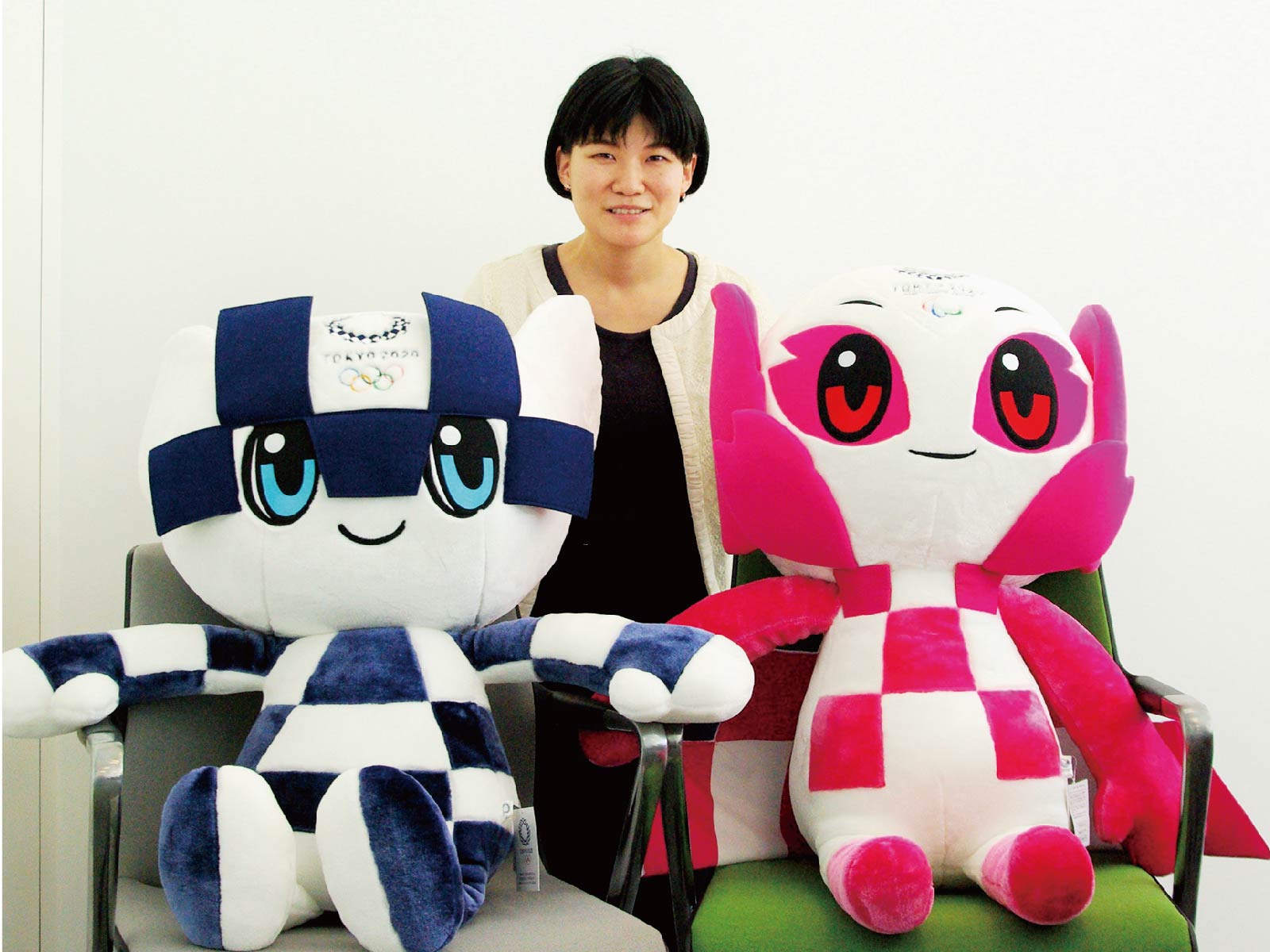 日本郵政のオリンピック・パラリンピック室で働く矢嶋さんと、東京2020大会の公式キャラクターたち。